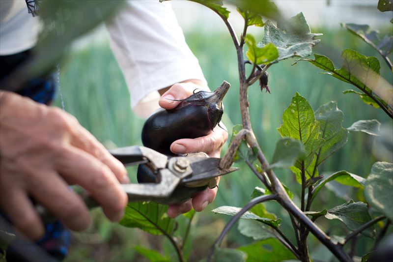 ピーマン・ナス・トマトなどの実をつける野菜は、ハサミを使ってヘタの根元から切り取ります。